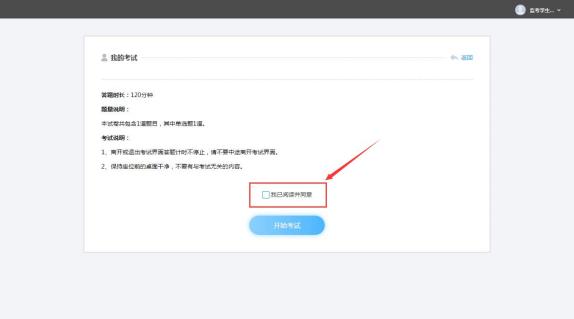 (2)开始考试后,学生阅读考试说明后,勾选我已阅读并同意后,点击开始考试按钮即可进入考试作答页面。