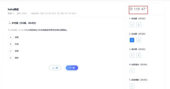 右上方显示考试限时及倒计时,请在限时之内完成并提交,否则系统将自动提交答卷。