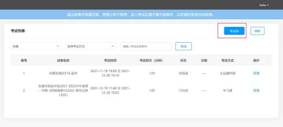 (1)登录后,考生可通过考试列表点击对应考试“开始考试”或切换到考试码页面输入考试码(老师提供)/考试列表进行考试。